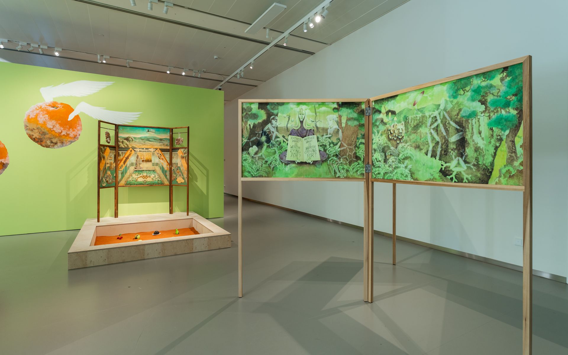 The floating shoji walled buildings are depicting scenes of me and my family. I painted us as dolls.